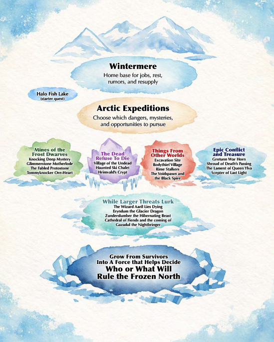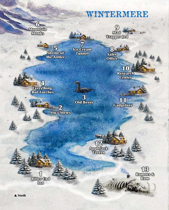 Built around a saltwater lake that never freezes, Wintermere is the beating heart of the Frozen North: a warm refuge of taverns, rumors, sled teams, strange locals, and secret tunnel access beneath the snow.